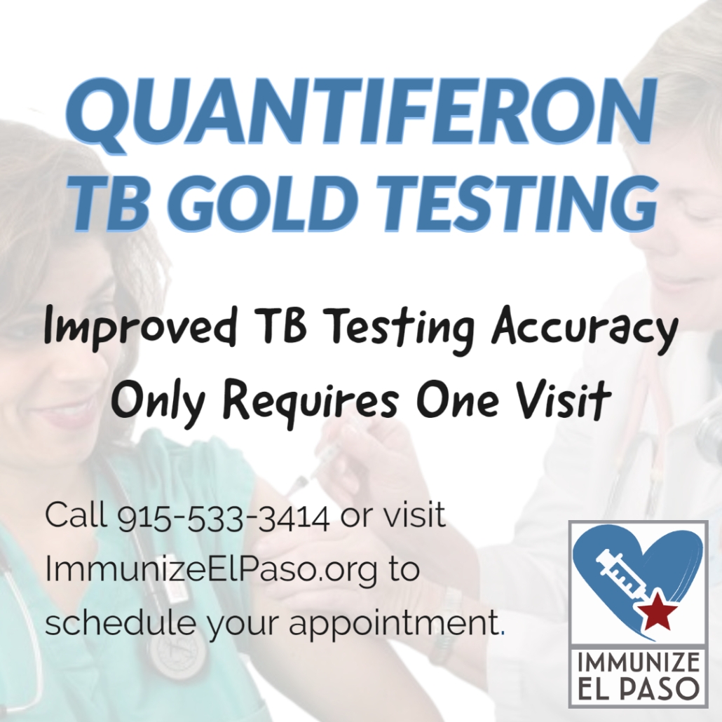 Many schools, employers, and other institutions are now asking for a QuantiFERON-TB Gold Blood Test (QFT+ or QFT-Plus) tuberculosis screening, as opposed to the TB skin test. Immunize El Paso now offers the QuantiFERON TB Gold test at each clinic location.